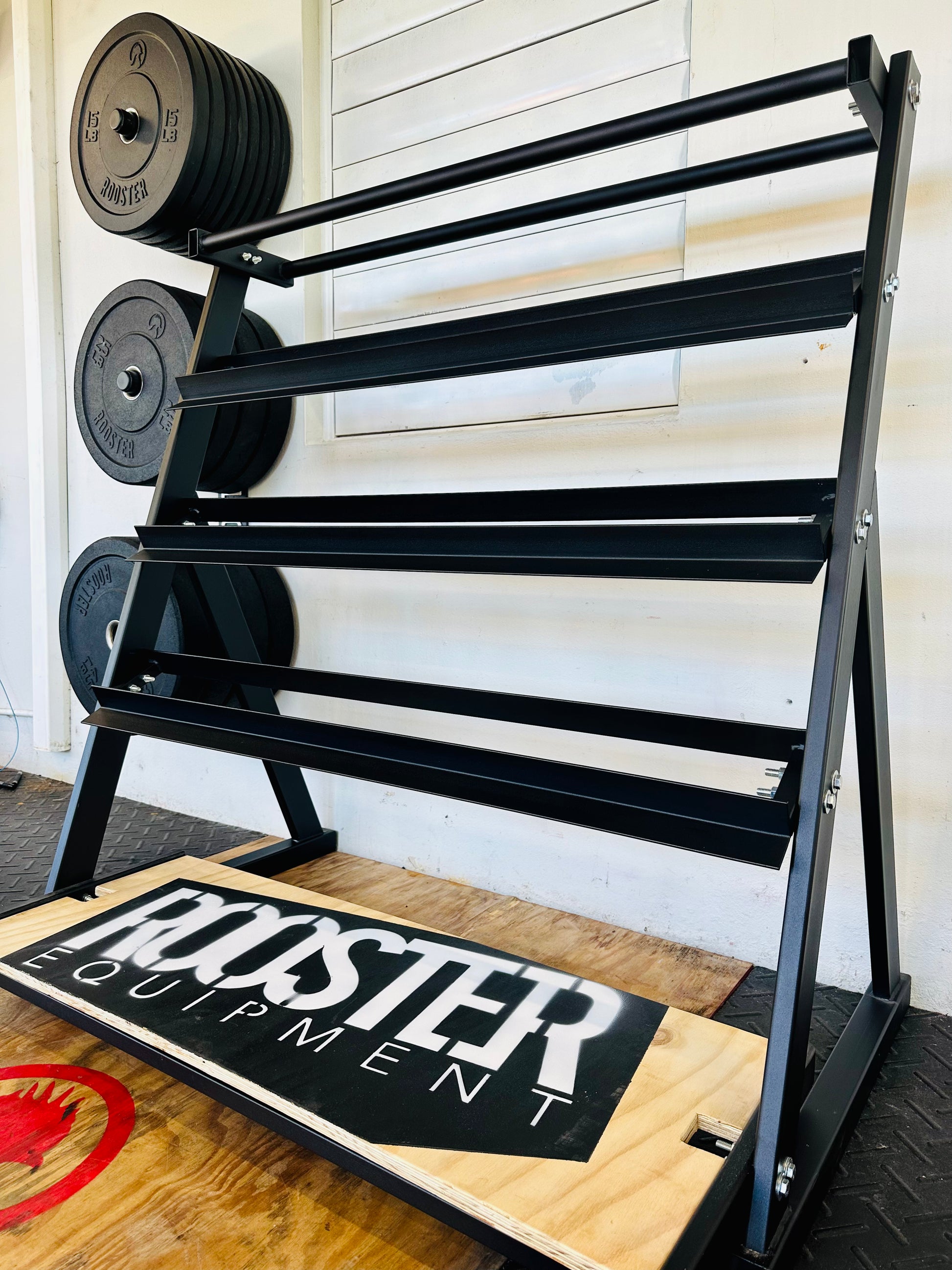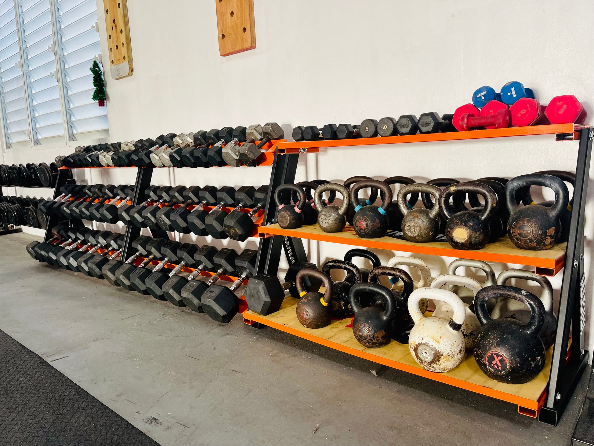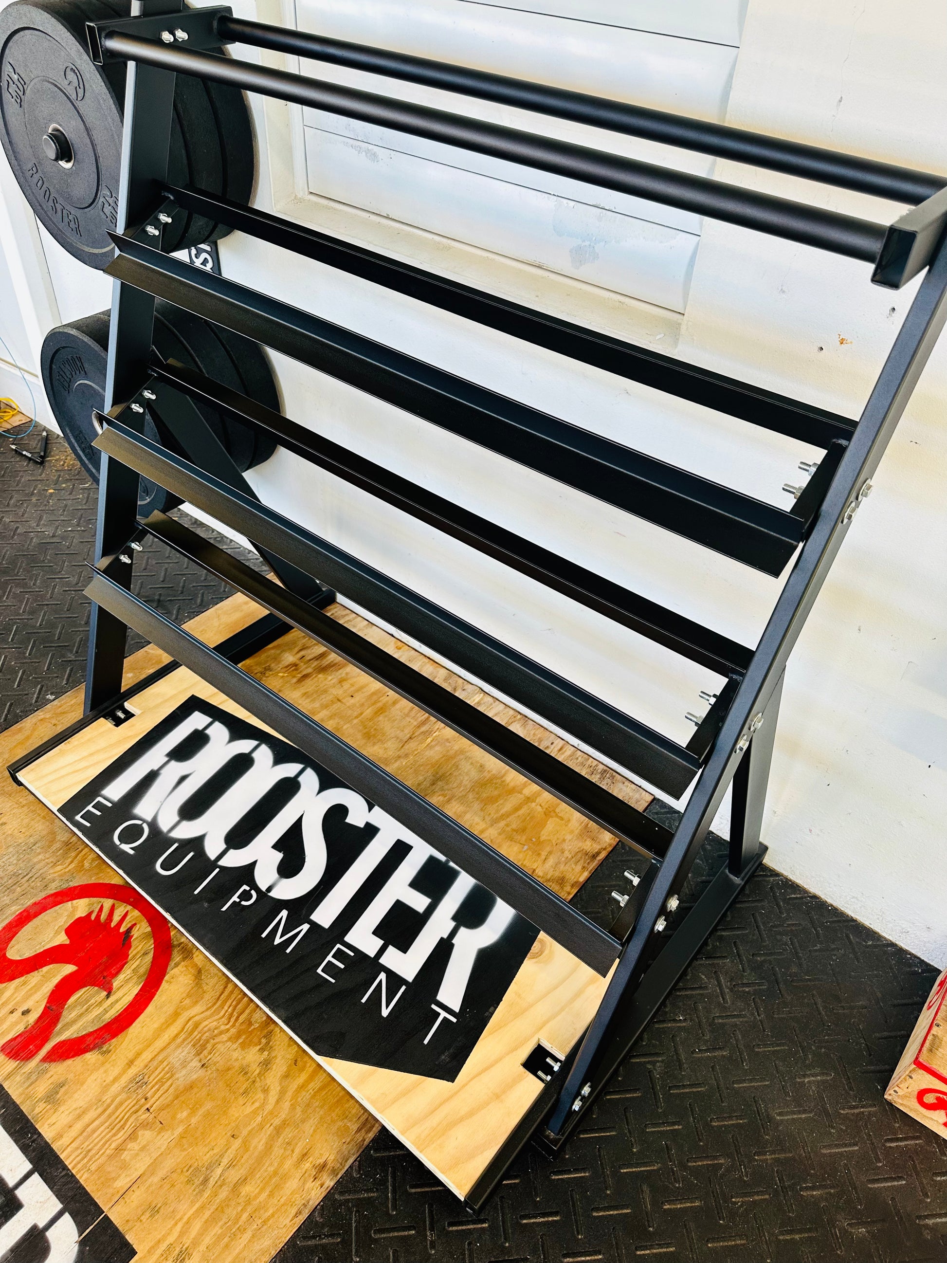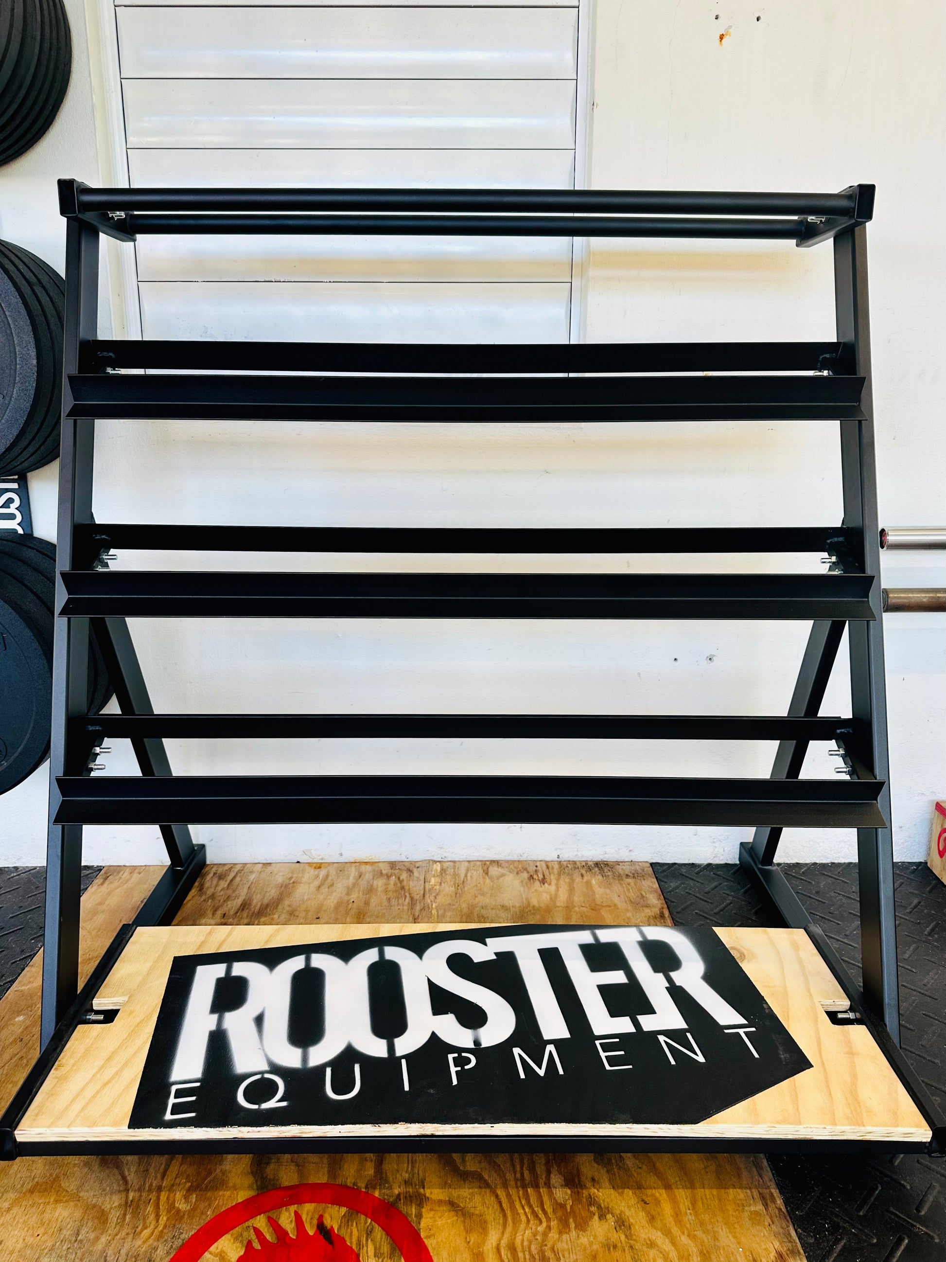 Este rack de almacenamiento viene en 2 versiones, una de la versiones es completamente para el almacenamiento de dumbbells, pero si buscas también almacenar kettlebells en un lugar más accesible que el piso el suelo pues tenemos la segunda versión que cuenta con una tercera tablilla para los kettlebells. Las version 1 se compone de 3 tablillas de 4’ cada una logrando almacenar una cantidad inmensa (dependiendo del tipo de dumbbell) y la versión 2 cuenta con 2 tablillas de dumbbells y 1 para kettlebells. La altura de este rack es de 3’ y sus tablillas pueden ser de la carta de colores que tenemos.